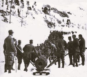 V gorah Adamella stoji nenavaden stražar: šesttonski top, poimenovan »Ippopotamus« (povodni konj – tudi Hippopotamus), ki nikakor ne sodi v…
