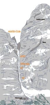 Ostra, globoka zareza levo od Hudičevega stebra v steni Prisojnika s prav tako srhljivo zvenečim imenom mi je že zgodaj padla v oči. Je ena tistih lepih, elegantnih linij, ki ti zaredijo v možganih željo To bi pa jz zlezu. Na slednji korak je po navadi iskanje informacij. ”Težavnost je odvisna od snežnih razmer …” (ma ne!) je zgovoren vodniček. Kogar koli sem glede smeri kaj vprašal, mu je uspelo povedati le, da je brez veze oz. da s takimi šodri ni vredno izgubljati časa; mogoče je pristavil še to, da so žleb tudi že presmučali. Dobro, prvenstveno ga je sicer preplezal Uroš Župančič sam, leta 1936, samo on je bil itak baje ”utrgan”, smučali so pa tudi že marsikje, kjer sem se jaz lepše počutil z derezami na nogah, dvema cepinoma in obrazom proti steni. Bomo pač šli pogledat in poskusit.