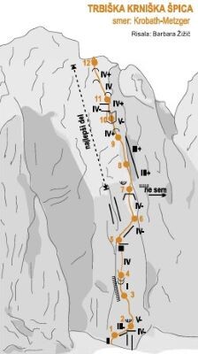 Zadnji del dostopa so nama popestrili ostanki kamnitega plazu; očitno se je pred kratkim privalil z velikega odloma na robu stene sosednjega vrha, ki ima v nasprotju s preostalimi samo italijansko ime: Cima Grande della Scala. Tudi na videz trdne stene so tu in tam krhke in krušljive, zato previdnost ni odveč. Nahrbtnike sva pustila pod steno in poleg opreme vzela s seboj le copate za sestop. Najina plezalska pričakovanja je nekoliko ublažila zavest, da smer Krobath-Metzger v Trbiški Krniški špici zame ne bo odkrivanje neznanega sveta: spoznal sem jo pred dobrimi desetimi leti, ko so matičarji imeli tabor v sosednji dolini, pri koči Pellarini. Takrat je bil z nami tudi Šrauf, ki je ravno za silo okreval po poškodbi v Steni, pa je kljub vsem težavam poleg svoje opreme pritovoril na tabor še kakih deset kil krompirja; ob večerih smo ga pekli ob tabornem ognju poleg šotorov. Imeli smo se lepo; malo pa nas je tudi skrbelo, ko smo nekega večera zaman čakali navezo, ki je šla plezat v Miss Julijcev. Navsezgodaj zjutraj sem vzel plezalke in na hitro sam šel čez smer. Opazil nisem nikogar, a skrbi me je že na poti nazaj v tabor rešila novica, da je pogrešana naveza varno prenočila v bližnjem bivaku. Vse v redu torej; meni pa od takratnega plezanja ni ostalo veliko v spominu, saj nisem bil čisto »pri stvari« …