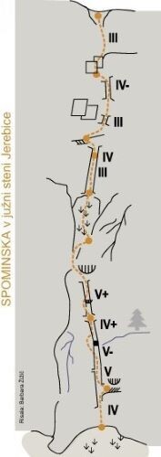 Dostop: Skoraj neverjetno je, koliko vojn so prenesli ljudje iz teh dolin, na katere vam pade pogled z Jérebce: od raznih prazgodovinskih prask, križarskih in Napoleonovih vojn do pol preteklih ran iz prve in druge svetovne vojne. Že kmalu po tistem, ko pustite avto ob bivši karavli v Možnici, lahko pri dostopu pod južno steno sredi strmega bukovega gozda na nekoliko izpostavljenih pečinah z malo pozornosti opazite grobe betonske ostanke opazovalnih utrdb rezervnih avstrijskih položajev, namenjenih zadržati morebitni preboj italijanskih enot s položajev okoli Velike Črnelske špice po dolini Možnice. Zložna lovska pot, ki jo je treba seveda spodaj na gozdni cesti najprej najti, nas v zavojih popelje po razgibanem pobočju, kjer se je treba včasih tudi za kaj prijeti. Ampak prava poslastica nas čaka, ko po dobre pol ure lovsko stezo ob stiku z grapo zapustimo in zavijemo desno navzgor v strme bele plati, po katerih skozi zanimive detajle (III) priplezamo na zgornje travnato pobočje, ki ga na desni strani omejujeta Mala Jérebca in nad njo Vzhodni raz (poleti 1 h, pozimi v snegu 2,5 h).