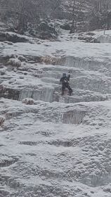 Kljub temu je bilo ledu ravno dovolj za prehod, celoten slap pa je Meglič preplezal v približno eni uri.