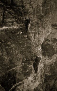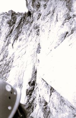 Na ta del stene sem se temeljito pripravil. Navezal sem se na vrv in boj za centimetre se je začel. Skala je bila trdna, navidez gladke plošče pa so ponujale zelo majhne prijeme in stope. Dani in Marjan sta mi sledila po vrvi s pomočjo žimarjev. Na nekaterih delih previsne stene je težavnost dosegla VII. stopnjo. Na enem teh mest je Danija, ki se je vzpenjal zadnji, odneslo iz stene, da je visel daleč proč od nje v zraku. Vendar naju je na vrvi hitro dosegel. Vse popoldne smo se dajali s previsno pregrado in šele popoldne smo splezali više, v malo bolj položen svet.