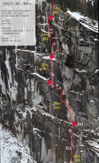 Smer Argos je bila preplezan v celoti trad(icionalno). V steni sta Simon in Manuel pustila šest klinov, na stojiščih devet vmesnih klinov in tre kline – kavlje. Za ponavljajoče se plezalce priporočata dva kompleta metuljev (3 in 4) in štiri kratke ledne vijake. Sestop je ob vrvi vzdolž smeri.
