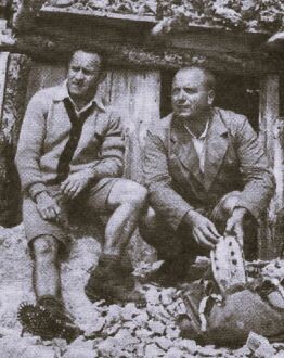 Slika kaže dva naša znamenita planinca-smučarja alpinista. Na levi je dr. Stanko Kmet, o katerem smo brali v PV 1963/12, da je lani dosegel 70 let, oni na desni pa je dr. Viktor Vovk. Prvi ima za seboj bogato tekmovalno in športno kariero, drugi pa nas s svojimi širokimi razgledi vodi po gorah, hribih in bolečinah na naši zapadni meji. Oba sedemdesetletnika sta še danes redna gosta v gorah in nam imata še marsikaj povedati.