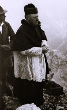 Dolga vrsta se je pričela premikati po poti na Škrlatico. Gosp. škof je ves čas vzdrževal enakomeren tempo, v kaminu pod vrhom pa se je izkazal kot odličen plezalec ter je ljubeznivo odklanjal pomoč Jožeta Čopa, ki je plezal pred njim. V pet in pol urah je dospela cela skupina na vrh Škrlatice. 160 Skalašev in planincev se je zbralo okoli križa. Uvodne besede je spregovoril predsednik jeseniške Skale g. Miha Čop. Predvsem je pozdravil prevzvišenega gosp. škofa dr. Gregorija Rožmana, ki se ni ustrašil naporna poti ter je prišel osebno na Škrlatico blagoslovit križ. Nadalje je pozdravil zastopnike planinskega polka, ki je poslal k tej slovesnosti dva oficirja in dijakanarednika dr. Miho Potočnika, ki sluti orožne vaje v tem polku. Pozdravil je zastopnika mariborske podružnica SPD gosp. Zorzuta ter vse ostale številne Skalaše in planince.