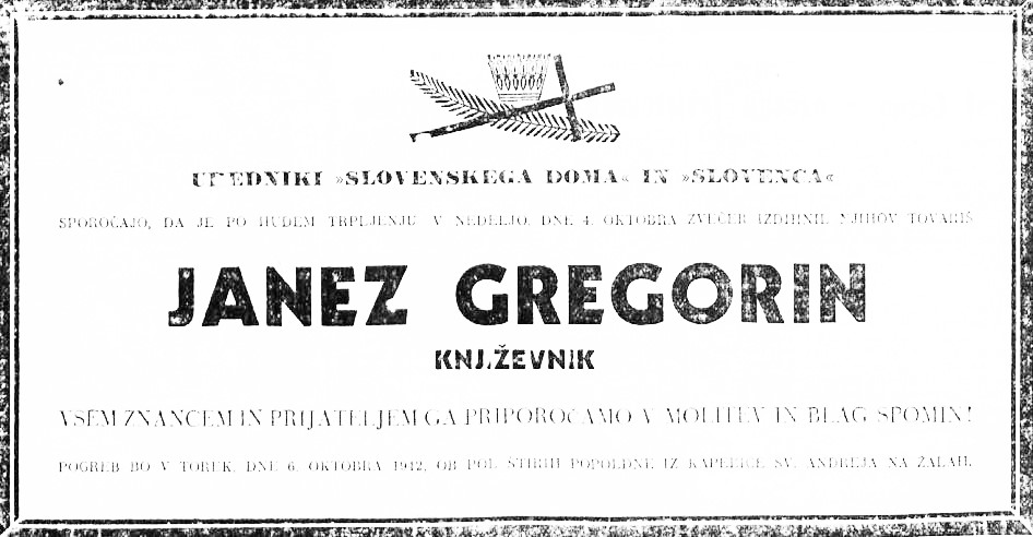 Bela žena je včeraj zatisnila oči po dolgi, hudi bolezni našemu stanovskemu tovarišu in publicistu Janezu Gregorinu, staremu komaj 31 let. Ljubitelji lepe slovenske besede, planinci in kulturni delavci so pokojnika poznali po njegovih umskih sposobnostih, značajnostnih odlikah in tovarištvu.