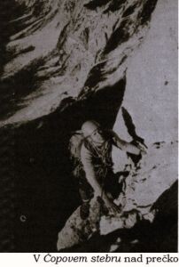 Marko je že tu. Kako pa sedaj preko mene? Dolgo se ne smeva obotavljati in že čutim njegove podplate na stegnih, ramah in nazadnje na čeladi! Marko počasi napreduje. Nekaj časa mu da misliti in opraviti previs, ki res ni velik, je pa precej neroden. Stojišče si napravi v veliki luknji pod znano prečko. Tu se tudi vprašava zakaj nosiva s seboj fotoaparate, če nič ne slikava. Tako nastanejo prvi posnetki iz Čopovega stebra. Zdaj pa do prečke. Nič kaj lahko ni. Premagati moram še en previs. Vsakokrat, ko se potegnem naprej, zadenem z glavo v skalo. Dobro da imam čelado. S težavo se le zbašem na poličko, po kateri moram prečiti nekaj metrov v levo. Polička teče nad previsi in iz nje se lepo vidi v dno stene, več kot tisoč metrov. S prečke poteka smer navzgor za lusko in nato nazaj v desno pod zajedo, kjer si uredim stojišče. Tudi Marko ima pod prečko nekaj težav, a kljub temu je hitro ob meni. Od tu imava, kakor sva slišala, le še tri raztežaje do izstopa. Zajeda ni težka. Prav tako tudi ne naslednji raztežaj. Morala bi že videti vrh stene, vendar se ta le še kar dviga nad nama. Marko preči v levo in kmalu zaslišim vzklik, ki pomeni, da sva zunaj. Do vrha stene se morava povzpeti le še po skalnati gredici nekaj deset metrov.