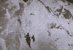Ob sedmih sva odrinila z Antejem proti Trisulu II, za menoj je bila neprespana noč. Vzel sem penicilin pa ni nič pomagalo. — Za vzpon nisva uporabila južnega grebena temveč sva vstopila v jugovzhodno steno s tehtnim vzrokom. Obe šerpi sta izjavili, da po grebenu ne nosita, ker je prenevaren, poleg tega so v tem vremenu stalne vrvi pod snegom. Prečila sva pod ledeniško robno počjo 200 m proti vzhodu in vstopila v vodni led stene v vpadnici prvega vrha. Uro težkega dela v čistem ledu, kjer sva napela 60 m stalne vrvi, nato 200 m strme vesine, prestop med serake in naravnost navzgor na sedlo za prvim vrhom Opis je tekoč, hodila sva pa vse drugače. Sneg je bil silno slab, strmina blizu 60° in jaz zelo bolan. Kljub bolečinam ob vsakem koraku nisem odnehal. Napori niso bili zaman Našla sva šibko točko Trisula II mesto za tabor in jutri ga opremiva. Čeprav dam zadnje od sebe in bolečine ne bodo ponehale bom nesel kot danes na 6400 m, na mesto kjer bo jurišna naveza zadnjič počivala. To naj bi bila midva z Antejem. Sedaj bom gledal s težkim srcem tisto dvojico, vendar z zavestjo, da sem bil v pomoč in dal svoj delež k skupnemu uspehu. Človek je bil, je in ostane samo človek — nikdar popoln gospodar samega, sebe.
