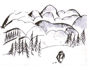 Nebo je sivo, temnosivo in iz oblakov naletava sneg. Planinsko polje je belo jezero. Ob robu so nametane ledene plošče, pol zasnežene, pol odkrite ko ogromne luske neke crknjene ribe. Gozd je zasnežen in poti so zasnežene. Samo sledi zajcev in srn in napetost v globoko upognjenih vejah daj e slutiti življenje. Gazim svež suh pršič in sopem. Z vrhov visokih smrek padajo bele zastave in drobni kristali silijo v pljuča.