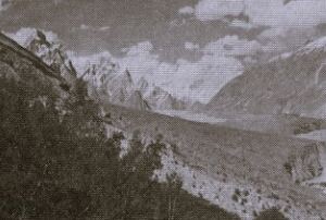 Zjutraj je bila cerada mokra. Odslej je bilo vedno tako, saj je bil ponoči mraz in padla je slana. Čudovit dan se je obetal, ko sva s Flipom spet hitela navzgor ob reki. Ne kaj preveč rada naju je spremljala koza, ki sva jo gnala že od Ashole gor, vendar je bil k sreči to njen zadnji dan, zvečer je odšla v trebuhe. Po kakih osmih kilometrih se nama je izza ovinka prikazala scena, ki smo jo že težko pričakovali — ogromni ledenik Baltoro, okoli njega pa visoki vršaci Karakoruma. Kar stala sva in gledala, tako, da se je že kozi, ki ni bila vajena takih postankov, čudno zdelo. V zadnji tabor pred ledenikom sva prišla že zgodaj popoldne. Čudovit prostorček je bil. V topolovem gozdičku veselo klopota potok in prva stvar je bila, da sva se temeljito očedila in oprala umazano perilo. Počasi so prihajali tudi nosači. Lenarili in poleževali smo po travi, in se nič kaj dobro nismo zavedali, da je bil tole tukaj zadnji dar narave, od sedaj naprej smo imeli samo led in kamenje. Sredi maja smo bili tako v oblasti ogromnega ledenika Baltoro. Pet dni smo že hodili po njem, pa mu ni hotelo biti konca. Vse okrog nas so bile gore, tako lepe, da človek samo gleda. Za Mustagh sem že iz fotografij vedel, da je veličasten, vendar je ta pogled presegal vsa pričakovanja. Popolnoma sam se dviga iz višine pet tisoč metrov in skoraj osem tisoč metrov zgoraj prebada nebo. Pa K 2, drugi najvišji vrh na svetu, Broad Peak, ki mu je devištvo vzel legendarni Herman Buhi in še in še. »Arena, ki si jo vsak alpinist želi videti vsaj enkrat v življenju, usojeno pa je le redkim,« je nekoč zapisal himalajski papež Herman Dyhrenfurth.
