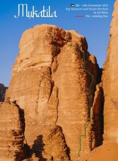 Po šestih dneh (med 8. in 14. novembrom 2025) osredotočenega plezanja v puščavi sta Fay Manners in Nicole Berthod splezali novo večraztežajno smer Mukatila (6a, A0, 405 m) na južnem delu gorovja Jebel Nassrani v Wadi Rumu, Jordanija. Smer poteka po 400-metrskem peščenjakovem stolpu in ponuja 11 raztežajev v tradicionalnem slogu, z najvišjo oceno 6a.