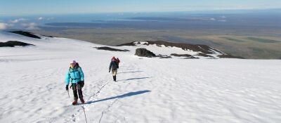 Zborno mesto je bilo ob petih zjutraj na parkirišču ob vznožju vulkana, na nadmorski višini okrog sto metrov. V počasnem tempu smo pridobivali na višini, po dobri uri smo dosegli sneg. Kmalu zatem smo se znašli na ledeniku in potrebno se je bilo navezati, saj so ledeniške razpoke kar pogoste. Letos še toliko bolj, ker je bila zima baje precej revna s padavinami. Sledila je dolga in položna vesina z imenom Flanka smrti, ker naj bi bila pač ubijalsko dolga.