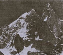 Čez robno poč si pomagam z dvema lednima kladivoma in šele potem si izbijem stojišče v sneg in varujem. Ko se izteče prvih 40 m vrvi, krene za Nadjo takoj tudi Sepp in tako napredujeta oba hkrati. Prvo snežišče je nesramno dolgo in stojišč sploh ni. V sneg si je treba večno na novo izbiti stopnico, se pritrditi na zabiti cepin in varovati. Takšno varovanje ni dosti vredno in vtis slabih varovališč je vedno bolj moreč. Na sredini spodnje vestne samo enkrat lahko varujemo ob skalah na varno zabitem skalnem klinu, potem do ključne skalnate stopnje ni nobenega duševnega pomora več. Sneg je odličen in zelo naglo smo napredovali. Sedaj bomo morali odplačati ceno za to. Nič ni zastonj! Za tri raztežaje velika srednja skalnata zapora je namreč vklenjena v sneg in vsak prijem bo treba izkopati izpod ledu. Sonce je že tako visoko, da se prožijo prve lavine in da slap drobcev ledu in kamenja na robu kaže, kje se bodo skale položile in nam dovolile po snegu naprej. Dragocene ure gredo v izgubo, pa še dvakratno, zoprno varovanj trojne naveze nam je v zamudo.