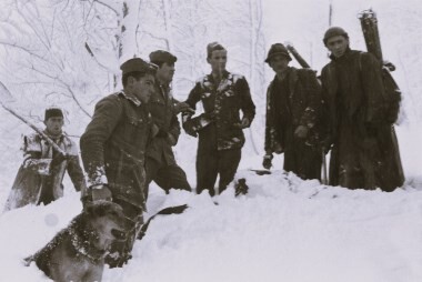 Zmenili smo se, da gremo z akkia naprej, da bomo naredili gaz za one s čolnom. Mlad poročnik, ki je bil pred nekaj urami v plazu, je zagazil naprej v celi sneg. V akkia smo se vpregli spredaj štirje, Makovec, Burnik, Roman Herlec in jaz, zadaj je potiskal Žvokelj. Herlec se šteje med »stare« in vedno poudarja, »mi stari moramo držati skupaj«. No, to noč je vlekel, kot bi imel šele dvajset let.