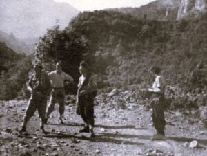 Po strmih zaraslih smo se hitro približali grabnu po katerem smo po par težjih in opasnih mestih priplezali do luknje, ki je za enkrat zapirala nadaljnjo pot pogled nanjo ni bil preveč vabljiv ter smo radi tega rajši malo spodobnejše govorili o vzponu. Navezali smo se v dve navezi, Jaz-Marjan-Miro in druga Bukovec-Lončar. Sezuli smo čevlje ter nato celo pot plezali v nogavicah, katere so nam izvrstno zamenjale plezalnike.