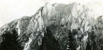 Ker sem bil prvi nisem mogel imeti dovolj varovanja ter sem se moral zanašati bolj na lastno spretnost. Bukovec pa kot član ni pokazal nobene večje sposobnosti ter sta ga prekosila še Marjan in Miro. Nad kamini smo prilezli zopet do večje luknje iz katere je bilo treba prečkati v desni. Tu smo našli tudi klin, ki ga je pozimi zabil Lojzek (Kodelca). Nad klinom se je stena v desni zelo krušila dočim je bil večji kamin vsled slabih prijemov zelo nevaren. Poizkusil sem rajši na steni ter se počasi premikal navzgor. Zgoraj stene sem zavil nazaj v kamin kjer je bilo dobro stojišče. Na steni bi kmalu naredil imeniten salto. Odkrušil se mi je na upogled dober prijem. Obdržal sem se k sreči z levo roko, ki pa tudi ne bi dolgo vzdržala. Zato sem lezel naprej previdnejše. Dvajset metrov nad steno smo naato šli po kaminu ki pa ni bil nevaren. Lahko bi ga imenoval graben. Tu se je začela navpična stena, ki ni imela dobrih oprijemov. Plezal sem naprej navzgor, nato pa sem prečkal desno kjer je bila stena bolj razrita. Mesta za zavarovanje tu ni bilo zato sem zlezel celo dolžino skozi ozek prehod med steno in skalo, ki se je tesno steni prilegala. Prehod je bil zelo strm, čisto navpičen kar je bilo treba velike pažnje. Prehod se mi je posrečil ter sem tudi tu našel mesto za zavarovanje. Ker nisem stal sigurno v slučaju padca Marjana sem zabil klin, ki je trdno prijel. Hitro sem dobil zadosti vrvi ter sem se splazil desno na greben in obenem iz stene. Tu ni bilo več nevarnost ker se je strmina nehala in po parih metrih smo stali na markirani poti. Zagledali smo piramido na vrhu katero smo takoj dosegli. Segli smo si veselo v roke in si čestitali. Sončni žarki niso bili baš topli toda dovolj za nas, ki smo bili prezebli zakaj v kaminu ni bilo toplo. Večkrat smo si morali pihati v roke kapuca veternega jopiča pa sploh ni bila za snet iz glave.