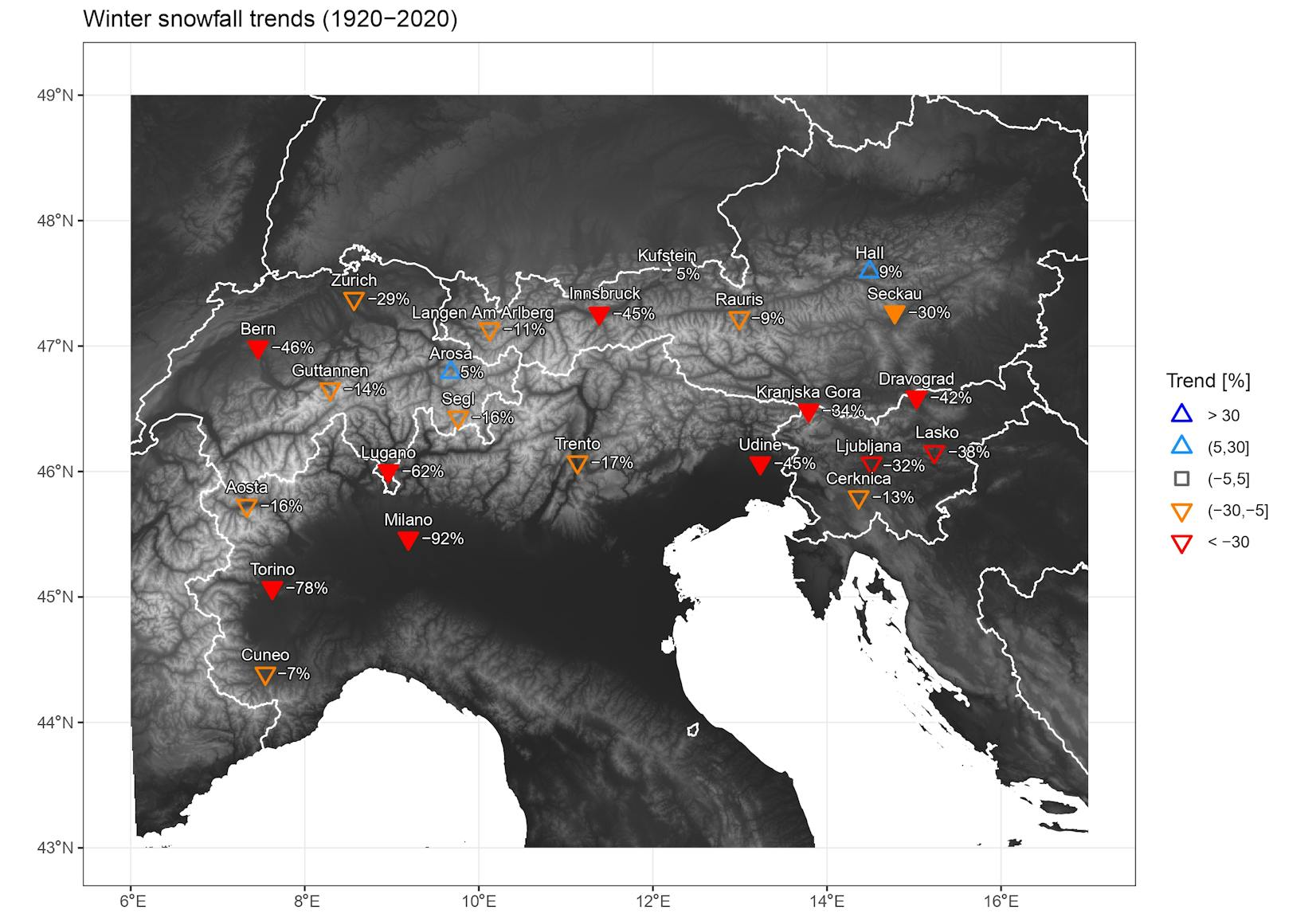 »V Alpah je opazen izrazito negativen trend novozapadlega snega s skupnim zmanjšanjem za približno 34 odstotkov. Zlasti opazno znižanje je bilo opaženo po letu 1980. Ta datum sovpada tudi z enako močnim dvigom temperatur,« pojasnjuje Michele Bozzoli, okoljski meteorolog pri Eurac Research in avtor študije. »Najbolj negativni trendi zadevajo lokacije pod 2000 metri nadmorske višine in so v južnih regijah Italije, Slovenije in dela avstrijskih Alp.