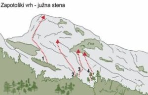 Opis poti: Za izhodišče borno uporabili prvo možnost, zavetišče pod Špičko. Nekoliko pred planinsko postojanko, kjer je velika skala, na kateri so markacije in kažipot proti Vršiču, Špički, Jalovcu, bomo zavili na desno po mestoma nakazani stezici, ki vodi čez melišče.
