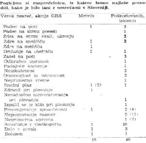 Če si ogledamo vzroke nesreč, ki so pogosto dokaj prikriti in zapleteni ter med seboj vzročno povezani, vidimo, da na čiste planinske nesreče odpade 25 ljudi. Že leta nazaj opažamo nezgode ljudi, ki so poklicno vezani na gorski svet, redno se pojavljajo primeri obolenj in nenadne smrti posameznikov, katerih vzrok sta srčna in možganska kap. Ob silnem razmahu smučarskega športa se ne smemo čuditi, da smrt posega že tudi v vrste oboževalcev belih strmin, pri če mer pa ugotavljamo, da je v preteklem letu terjala žrtve pri skrajno neprevidnih, ki so v mogli, metežu in neznanem svetu padali na snežišču izven utečenih smučišč.