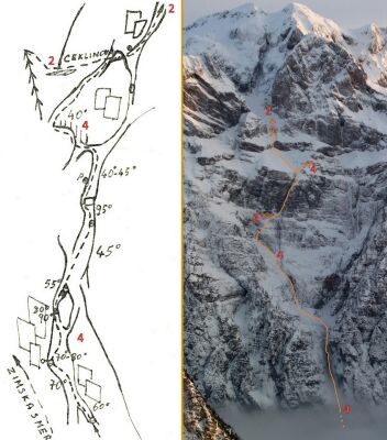 V dobrih zimah je smer doživela številne ponovitve. Kolaž prikazuje skromno skico, vris smeri v fotografijo in orodje, ki smo ga takrat uporabljali.