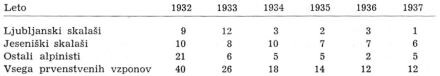 Pregled, sestavljen po podatkih, vzetih iz Planinskega Vestnika ter iz knjige »V naših stenah«, nam pokaže naslednje: Število prvenstvenih vzponov od leta 1932 dalje stalno pada. Zlasti pada pri tem delež ljubljanskih skalašev, pač pa raste delež jeseniških. Leta 1933 so ljubljanski skalaši opravili skoraj polovico vseh vzponov, leta 1937 le eno dvanajstino; Jeseničani so leta 1932 izvršili eno četrtino vseh prvenstvenih vzponov, leta 1937 pa polovico, to je toliko, kolikor vsi ostali slovenski alpinisti skupaj.